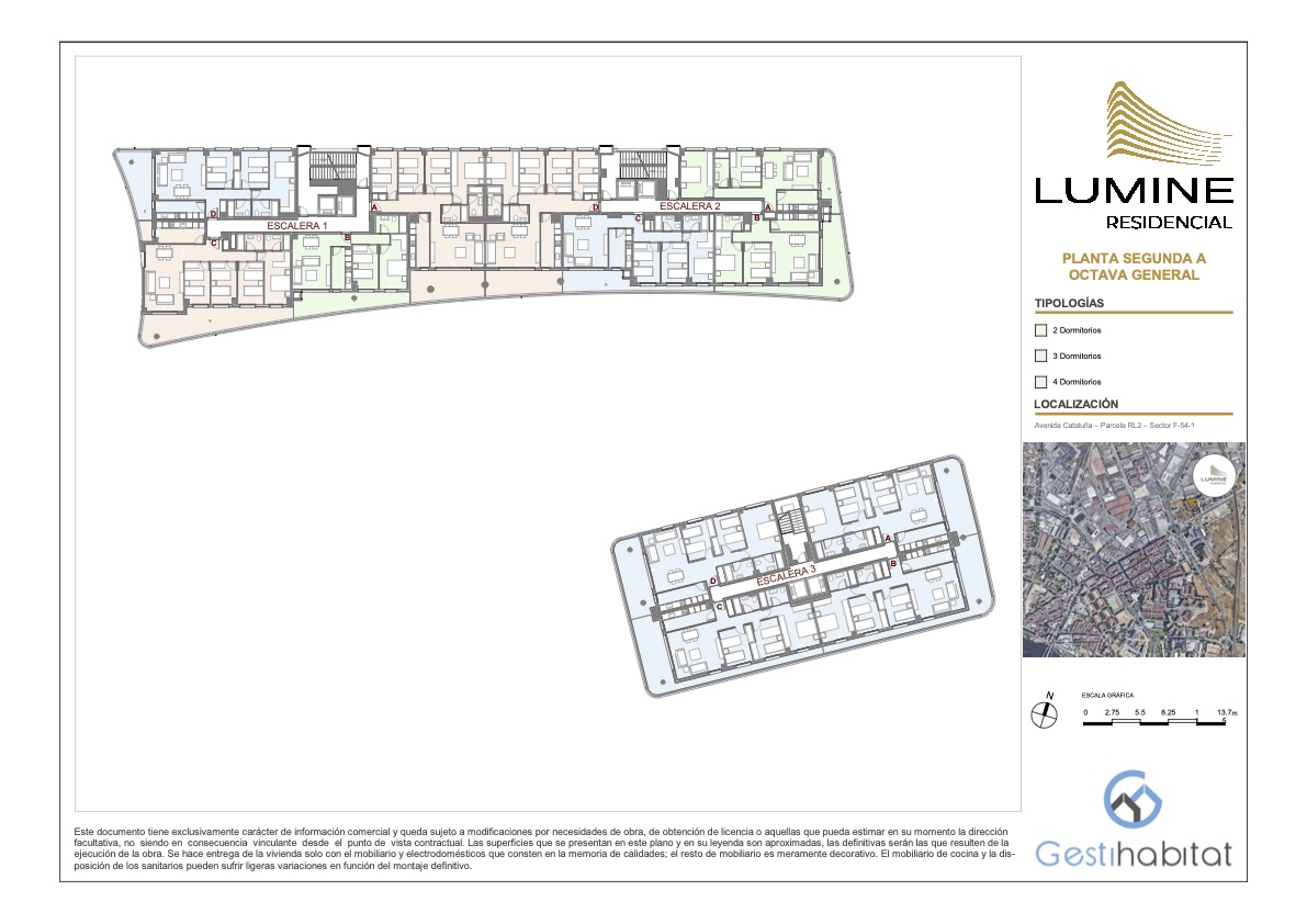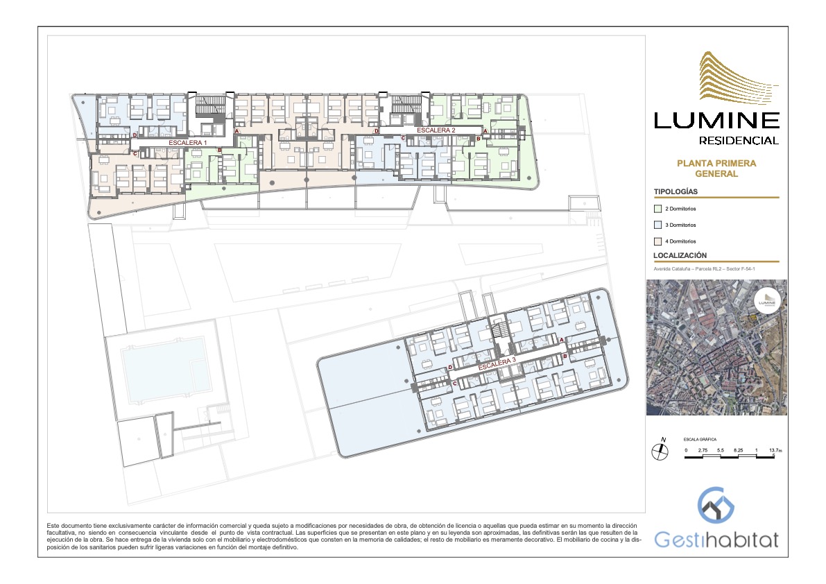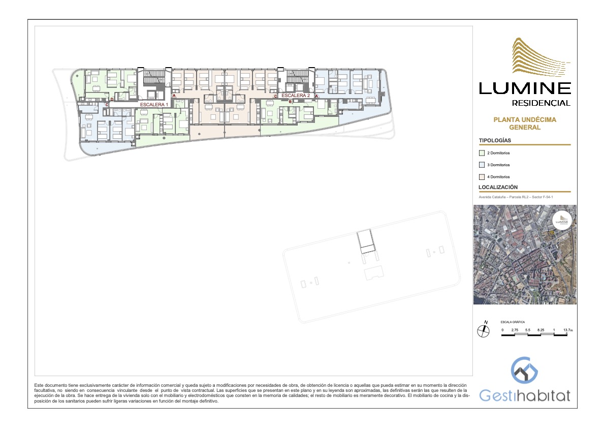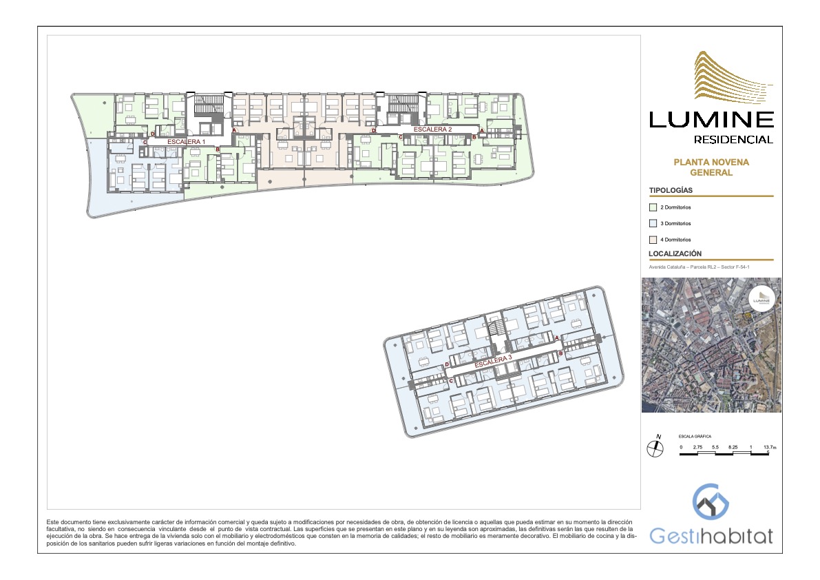 Lumine Residencial constará de dos edificios de planta baja + 12 y planta baja +9 respectivamente, sumando un total de 141 viviendas con diferentes tipologías de 2, 3 y 4 dormitorios. Las plazas de garaje y trasteros estarán ubicados en planta sótano con acceso peatonal desde los propios núcleos de escaleras de las viviendas y con acceso rodado mediante rampa.