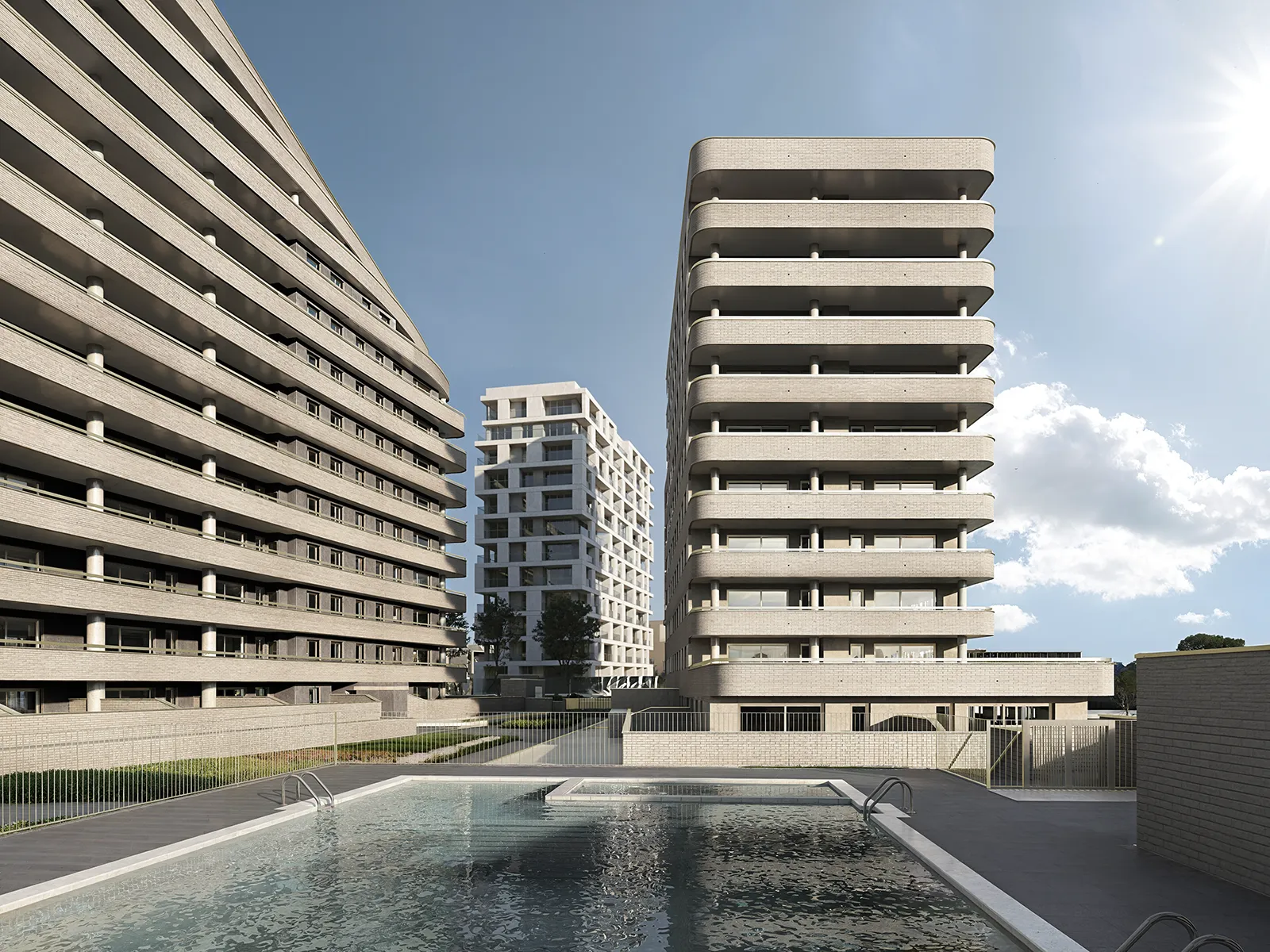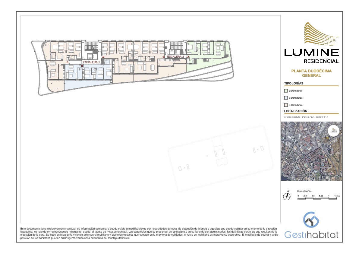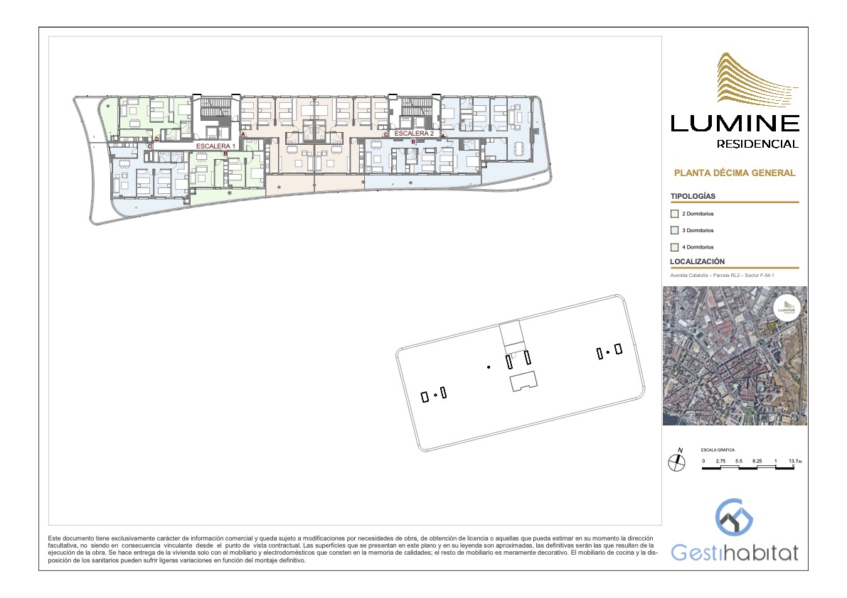 Lumine Residencial constará de dos edificios de planta baja + 12 y planta baja +9 respectivamente, sumando un total de 141 viviendas con diferentes tipologías de 2, 3 y 4 dormitorios. Las plazas de garaje y trasteros estarán ubicados en planta sótano con acceso peatonal desde los propios núcleos de escaleras de las viviendas y con acceso rodado mediante rampa.
